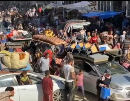 Centinaia di palestinesi sfollati lasciano le aree a est di Khan Yunis dopo che l’esercito israeliano ha emesso un nuovo ordine di evacuazione