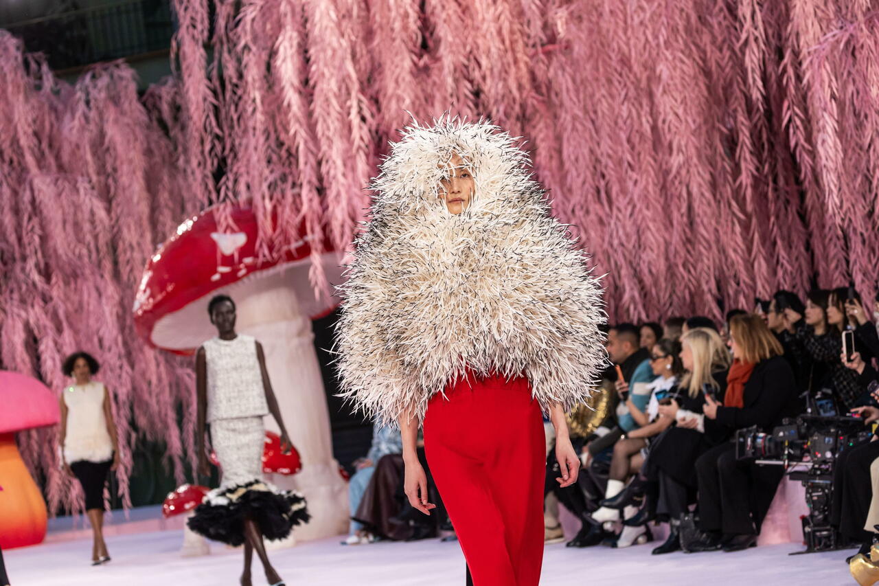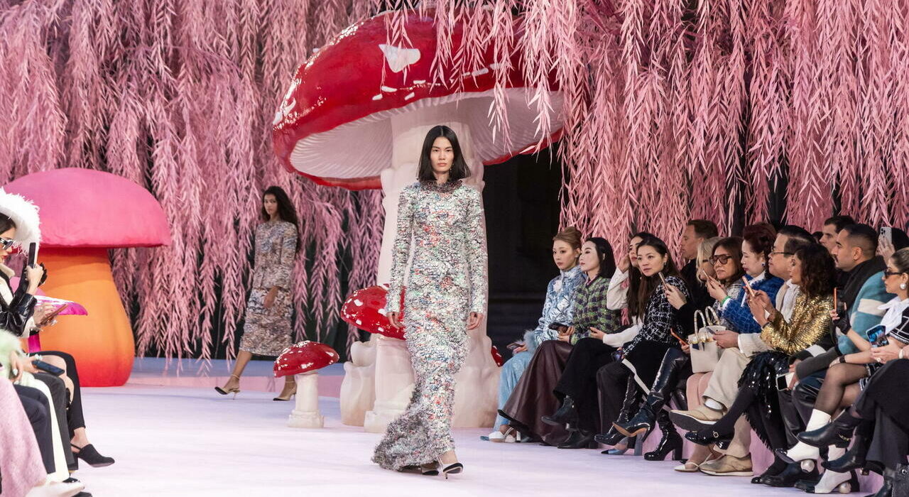 Uccellini e animali del bosco aiutano a cucire i vestiti, mentre le modelle scendono in passerella tra enormi funghi e salici dalle foglie rosa, sulle note di una canzone della Bella addormentata nel bosco. C’è tutto della favola (Disney, perché Matthieu Blazy in fondo è un Millennial semplice) al Grand Palais per la Haute Couture di Chanel. Una fiaba richiamata anche dagli abiti: i funghi degni del bosco di Alice nel Paese delle Meraviglie tempestano gli orli dei completi in trasparenza, piume come tentacoli si aprono sui maxi abiti, un po’ alla Ursula, la strega della Sirenetta.