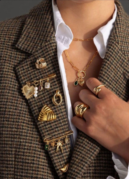L’accessorio è sempre importante, ma nel 2026 lo sarà ancora di più: le giacche diventano tempestate di spille, meglio se vintage, meglio ancora se cimeli di famiglia. Le maxi-spille si indossano sugli abiti, sulle sciarpe e perfino sui calzini (come visto da Simone Rocha). Collane e bracciali, intanto, si fanno massimalisti: massicci e dorati.
