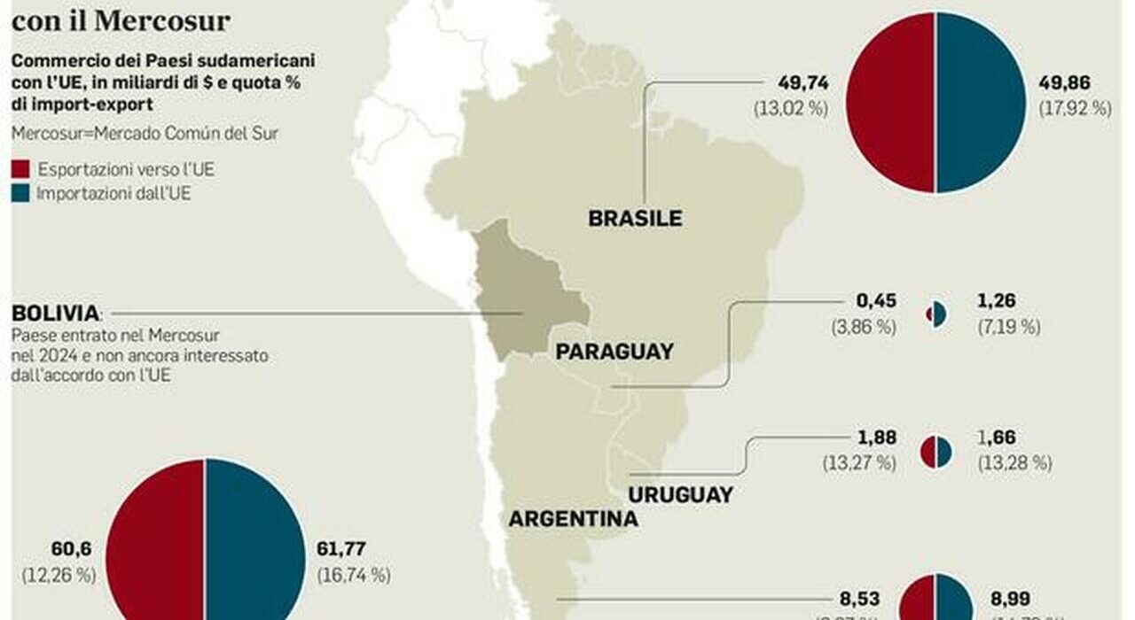 Le prospettive per le imprese italiane sono a dir poco incoraggianti tra un giro d’affari potenziale — nel medio termine potrebbe raddoppiare fino a 14 miliardi — e la cancellazione immediata di dazi pesantissimi. Due voci che, sommate, valgono in tempi brevi 4 miliardi. Nella corsa del made in Italy verso i 700 miliardi di export entro il 2027, i mercati del Mercosur possono garantire una spinta decisiva. E i numeri — sull’interscambio attuale o le tempi di crescita — non bastano da soli a far comprendere i vantaggi per l’Italia dopo il via libera all’accordo di libero scambio tra Ue e le principali economie del Sud America. Con il nostro sistema che qui piazza il meglio di meccanica, automotive, farmaceutica o chimica. E che spera di far salire voci oggi minori come lusso e food.