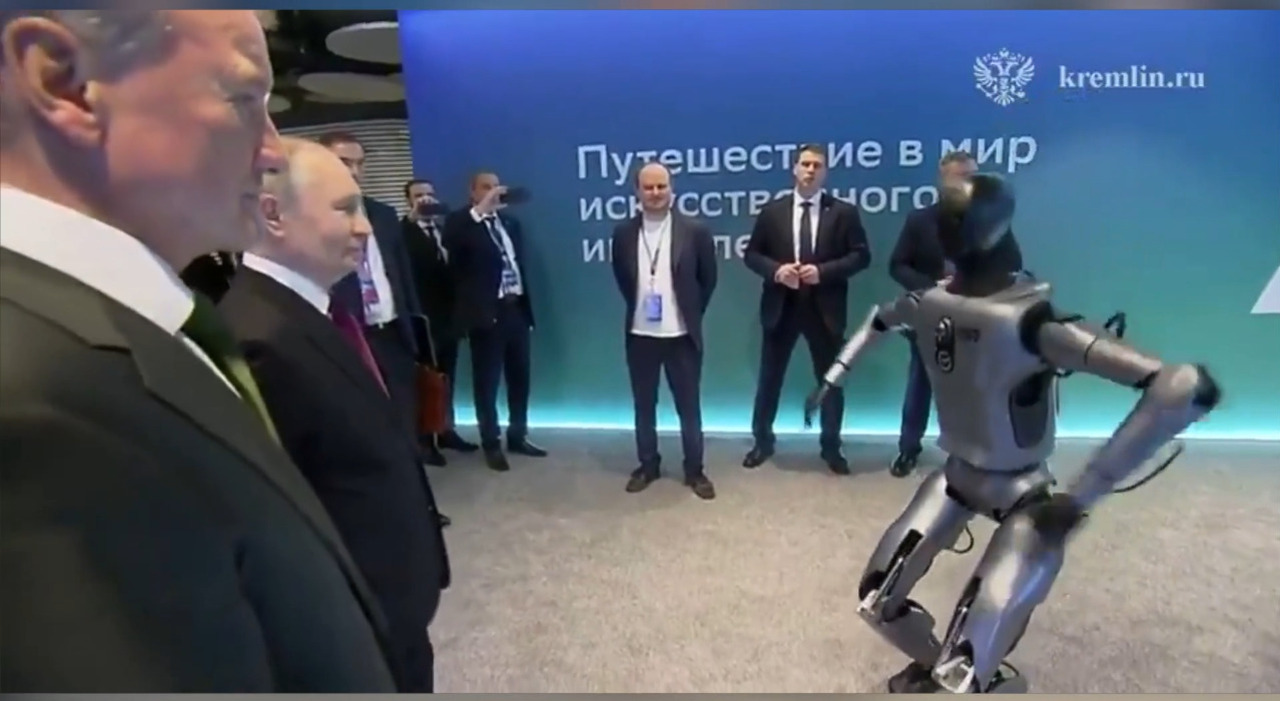 Durante una visita alla mostra collegata alla conferenza Viaggio nell’intelligenza artificiale a Mosca, Vladimir Putin ha osservato da vicino le ultime innovazioni russe nel settore dell’IA. Tra le presentazioni più rilevanti spiccava il robot umanoide Grin, sviluppato dal gruppo Sber Bank, che ha interagito con il presidente mostrando anche alcuni movimenti coreografici.