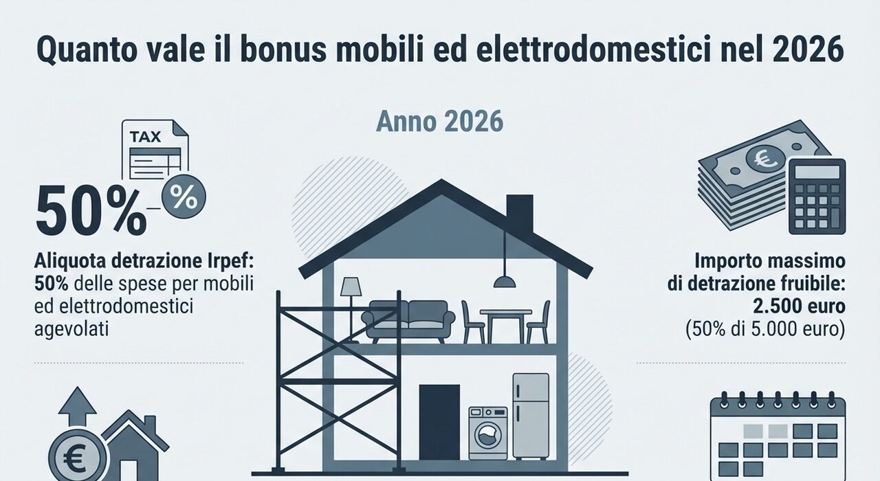 Nel 2026 l’Agenzia delle Entrate ha confermato e aggiornato la guida sul cosiddetto bonus mobili ed elettrodomestici, una agevolazione fiscale che consente di detrarre parte delle spese sostenute per arredare e attrezzare un immobile oggetto di lavori di recupero edilizio. La detrazione si applica come sconto Irpef pari al 50% delle spese sostenute nel corso dell’anno, fino a un limite massimo di 5.000 euro (quindi il sostegno vale fino a 2.500 euro). Questa misura è stata confermata nella legge di Bilancio 2026, senza modifiche sostanziali rispetto al 2025, con l’obiettivo di sostenere i contribuenti che affrontano spese per ristrutturare e migliorare le proprie abitazioni.