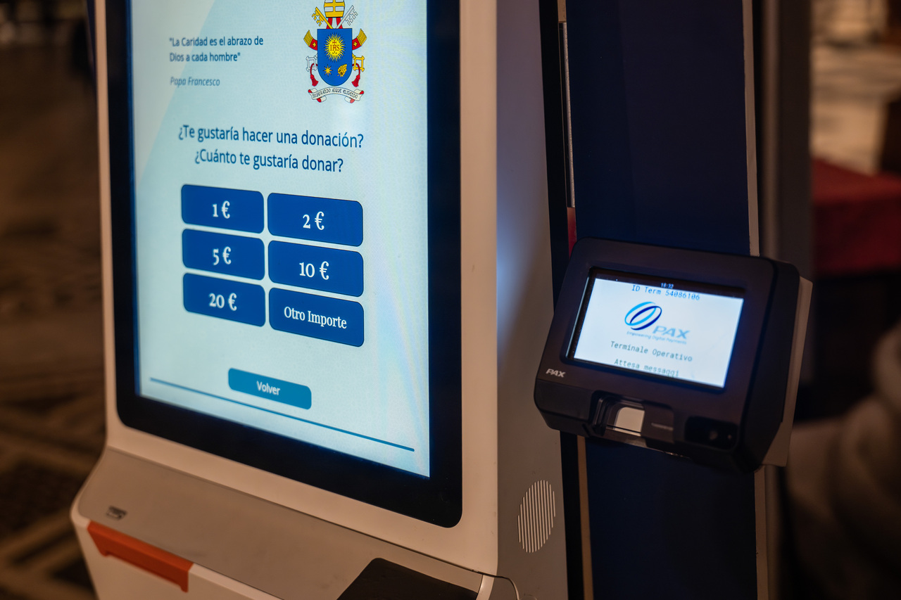 Il sistema propone in automatico 1, 2, 5,10 e 20 euro oppure si può digitare una cifra diversa. Sullo schermo anche una citazione di papa Francesco: «La carità è l’abbraccio di Dio ad ogni uomo».